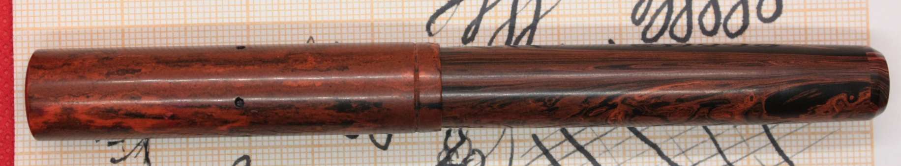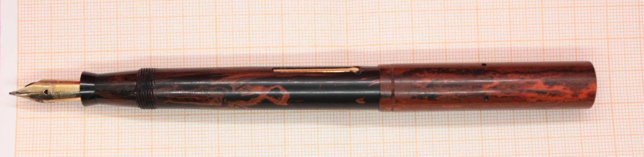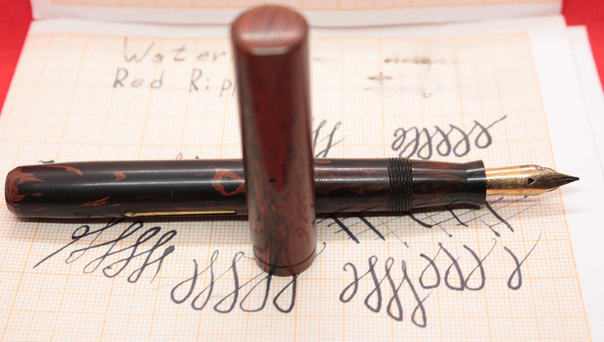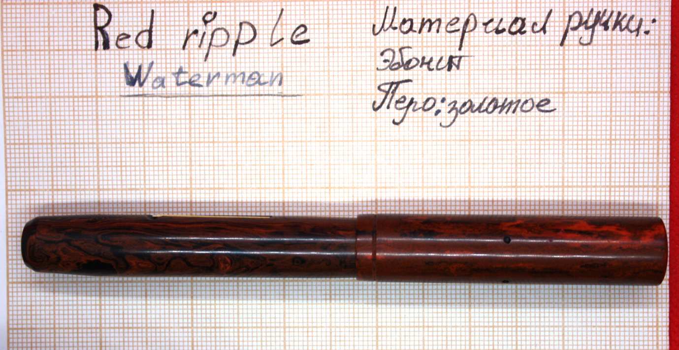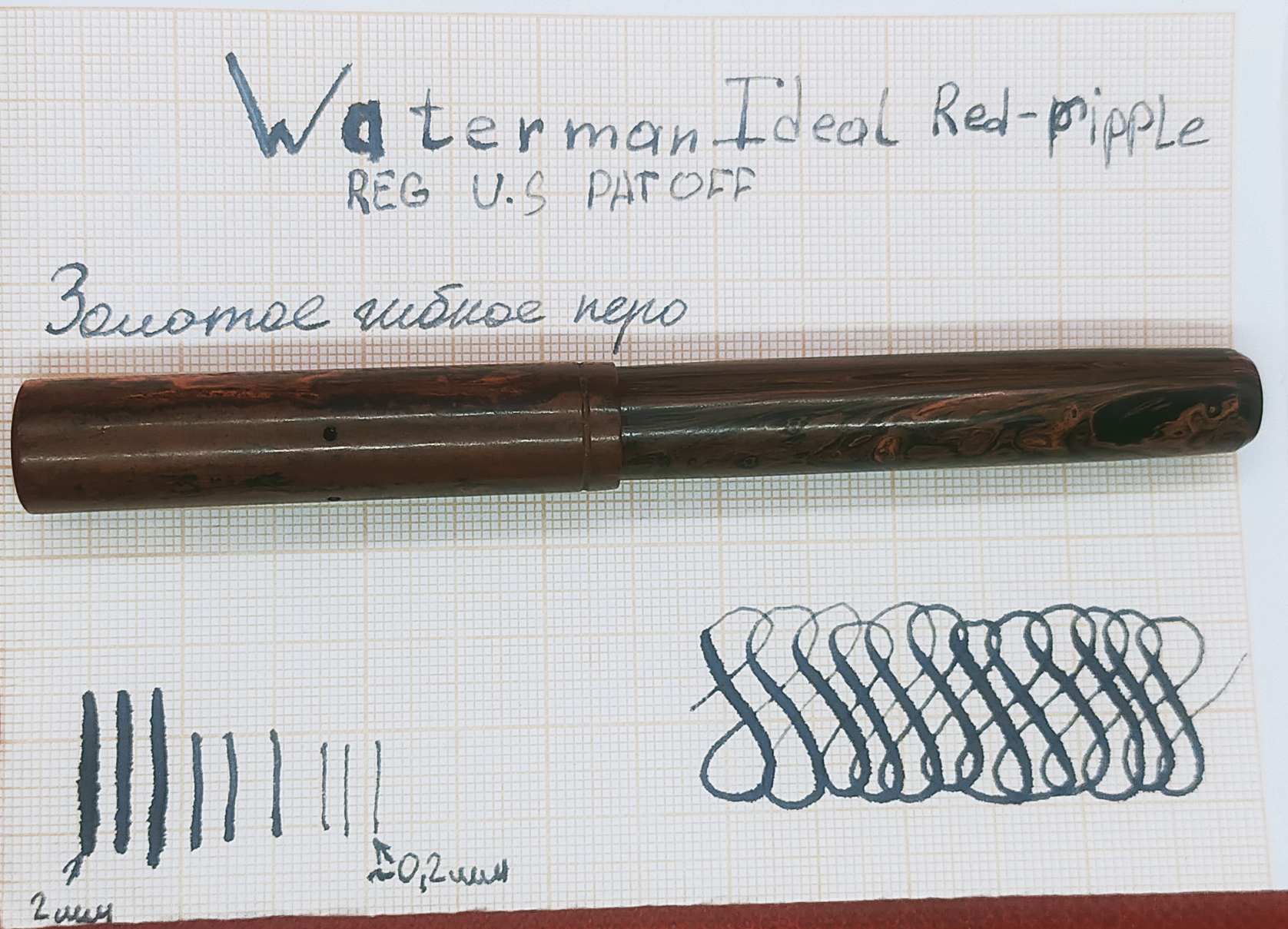 Крупная ручка с гибким золотым пером F от Waterman 55 (США). По размерам соответствует. Корпус — эбонит red ripple.