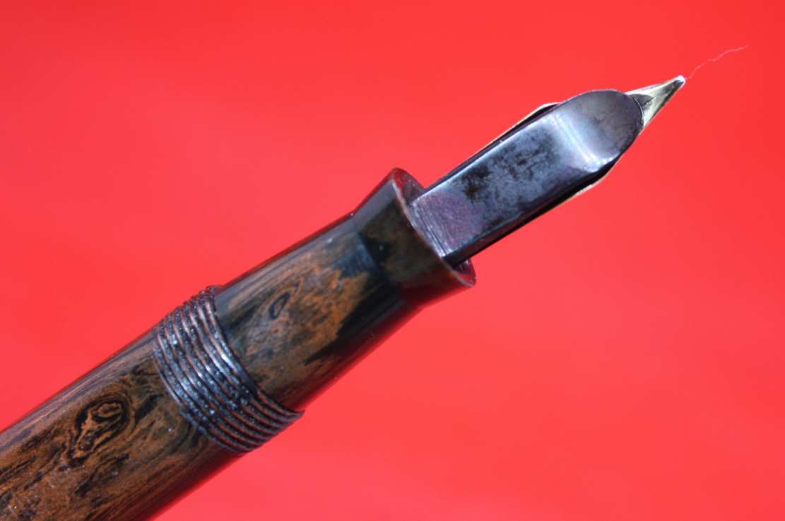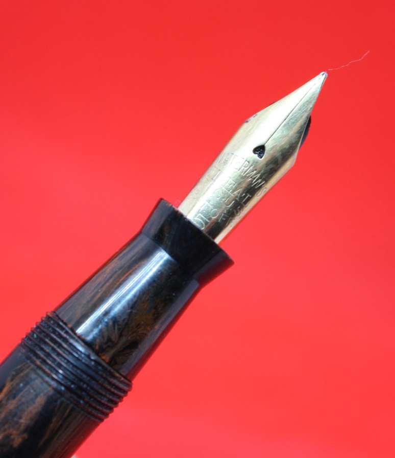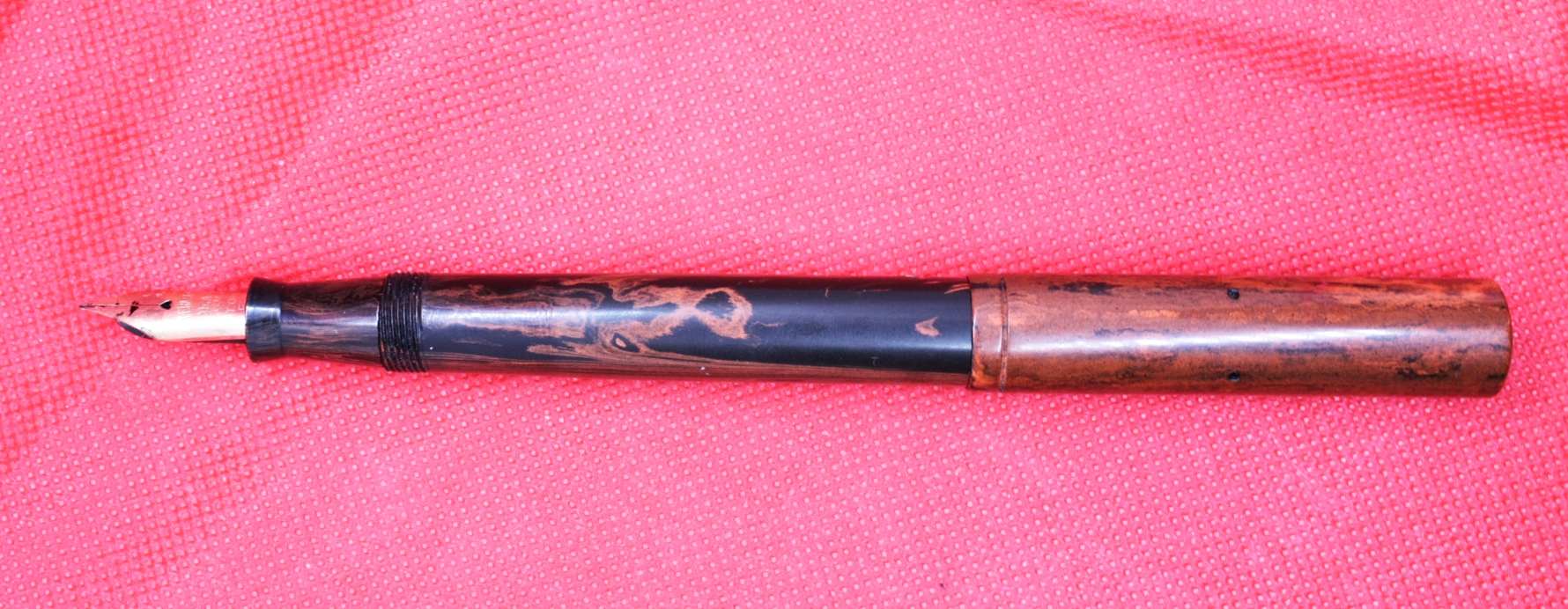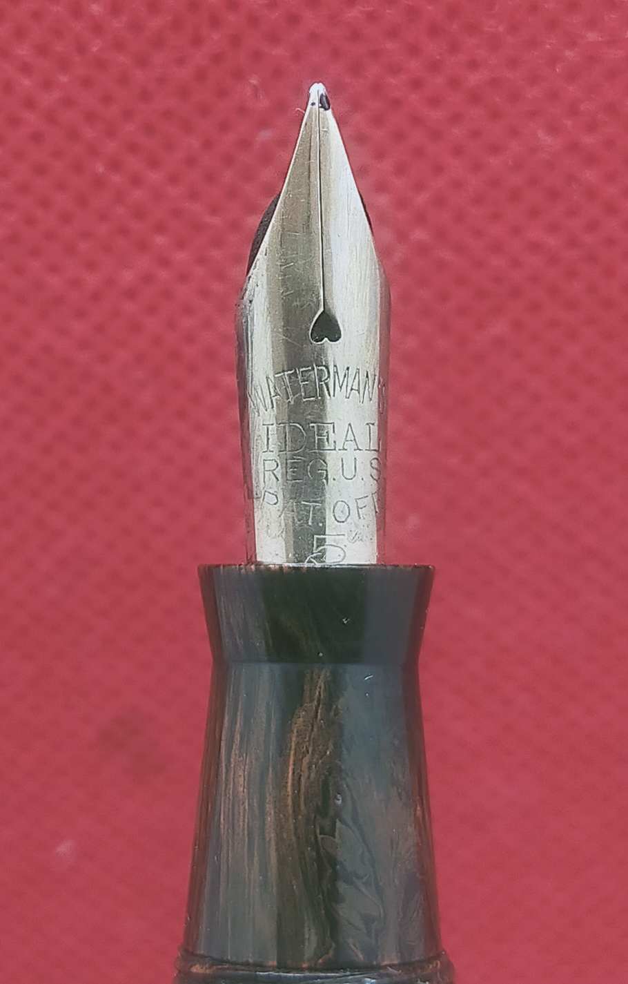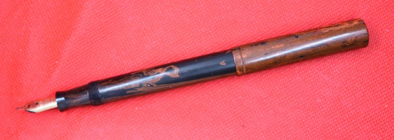 Крупная ручка с гибким золотым пером F от Waterman 55 (США). По размерам соответствует. Корпус — эбонит red ripple.
