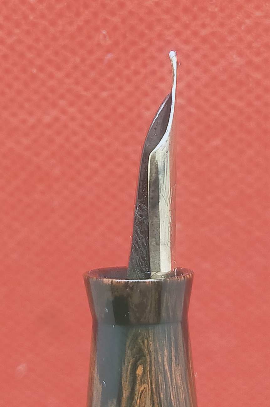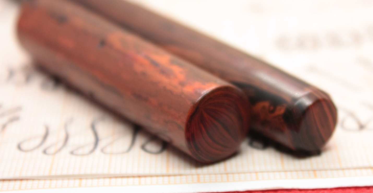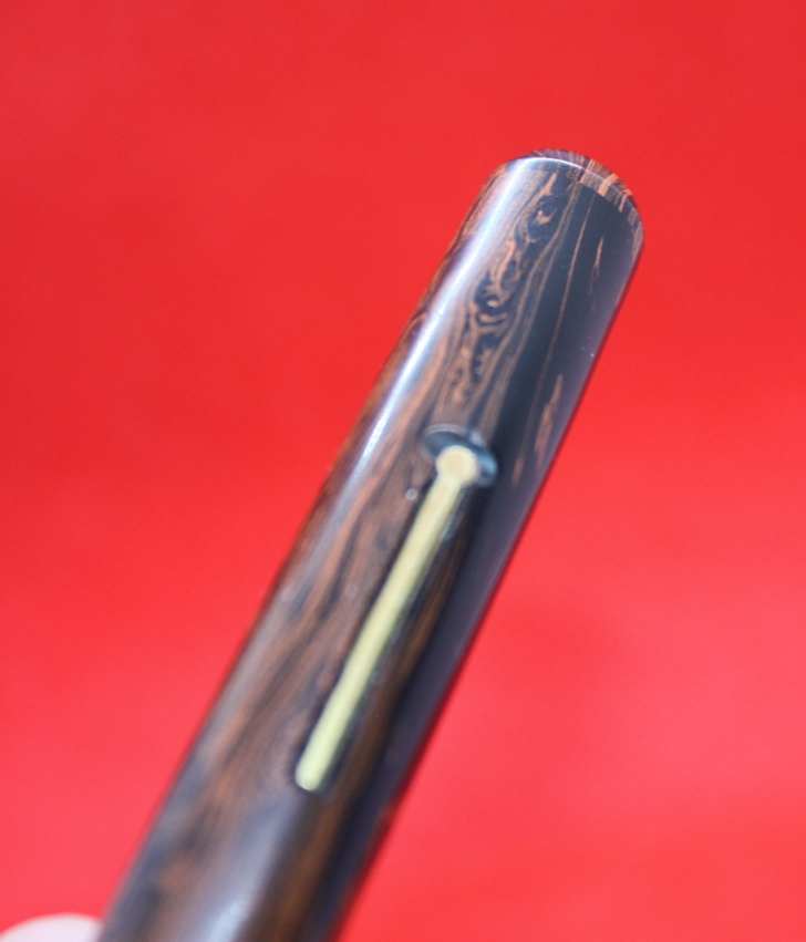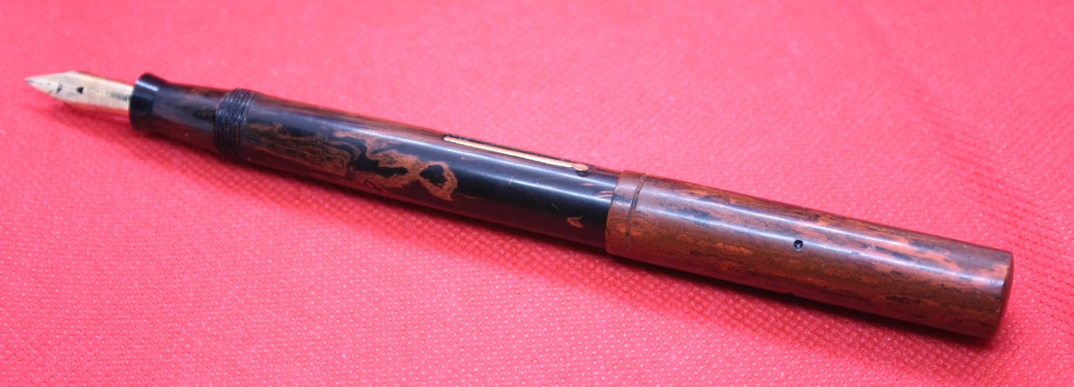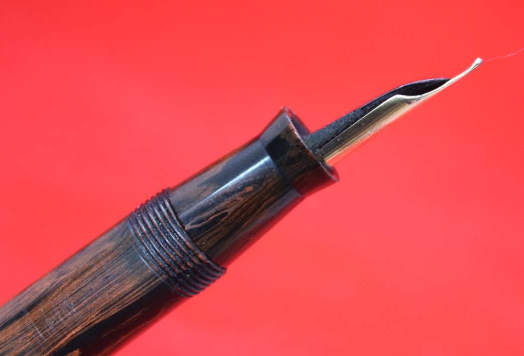 Крупная ручка с гибким золотым пером F от Waterman 55 (США). По размерам соответствует. Корпус — эбонит red ripple.