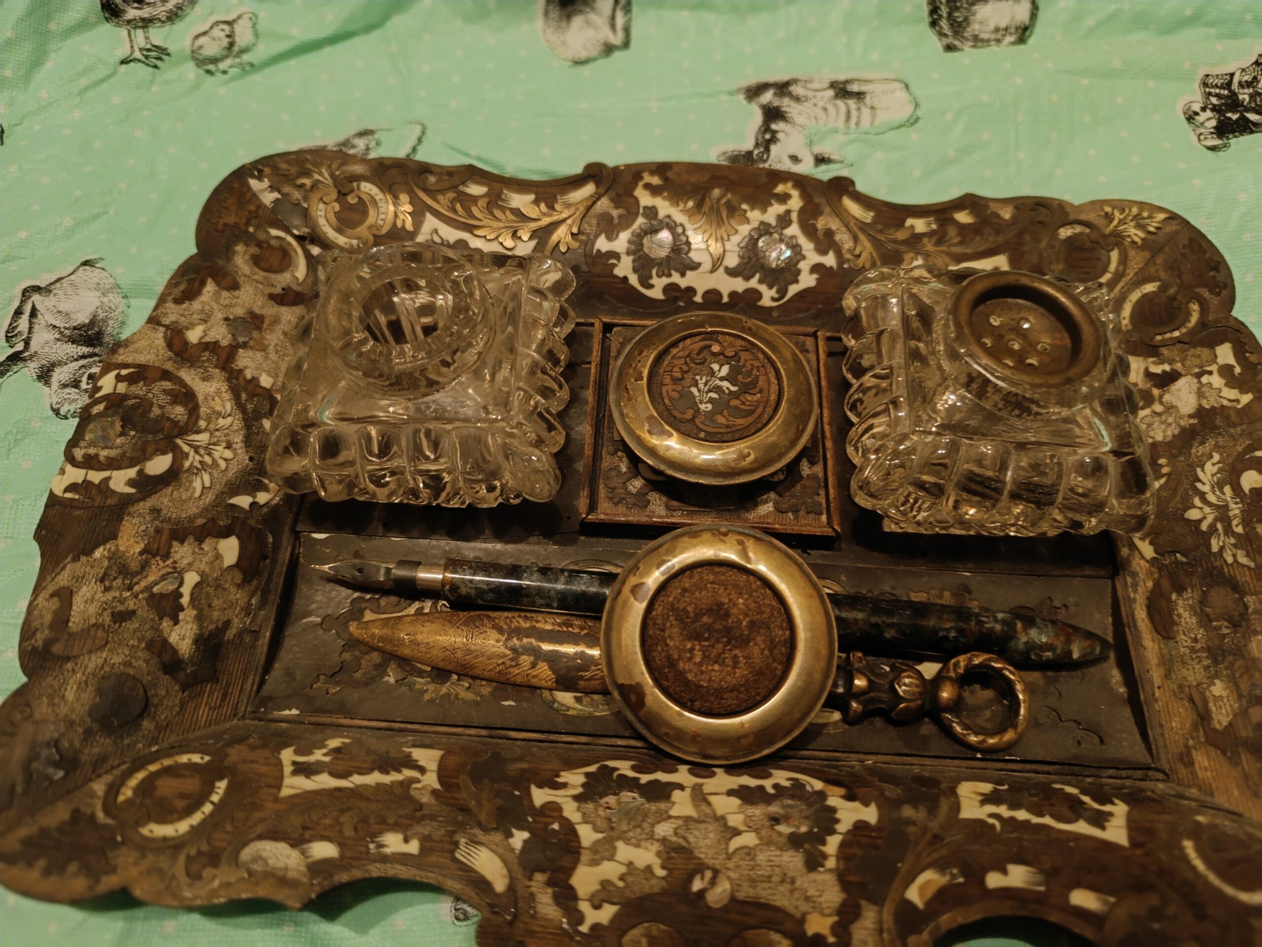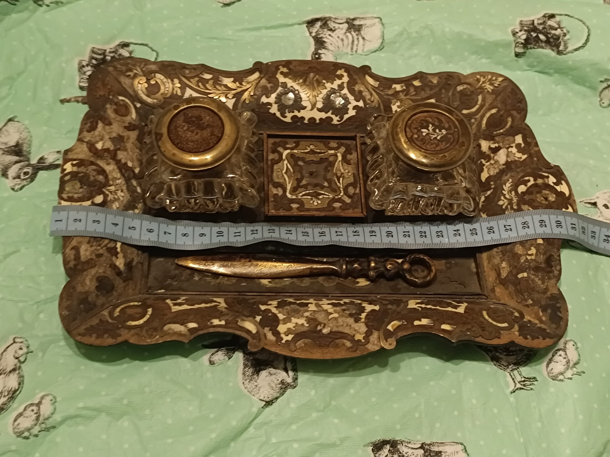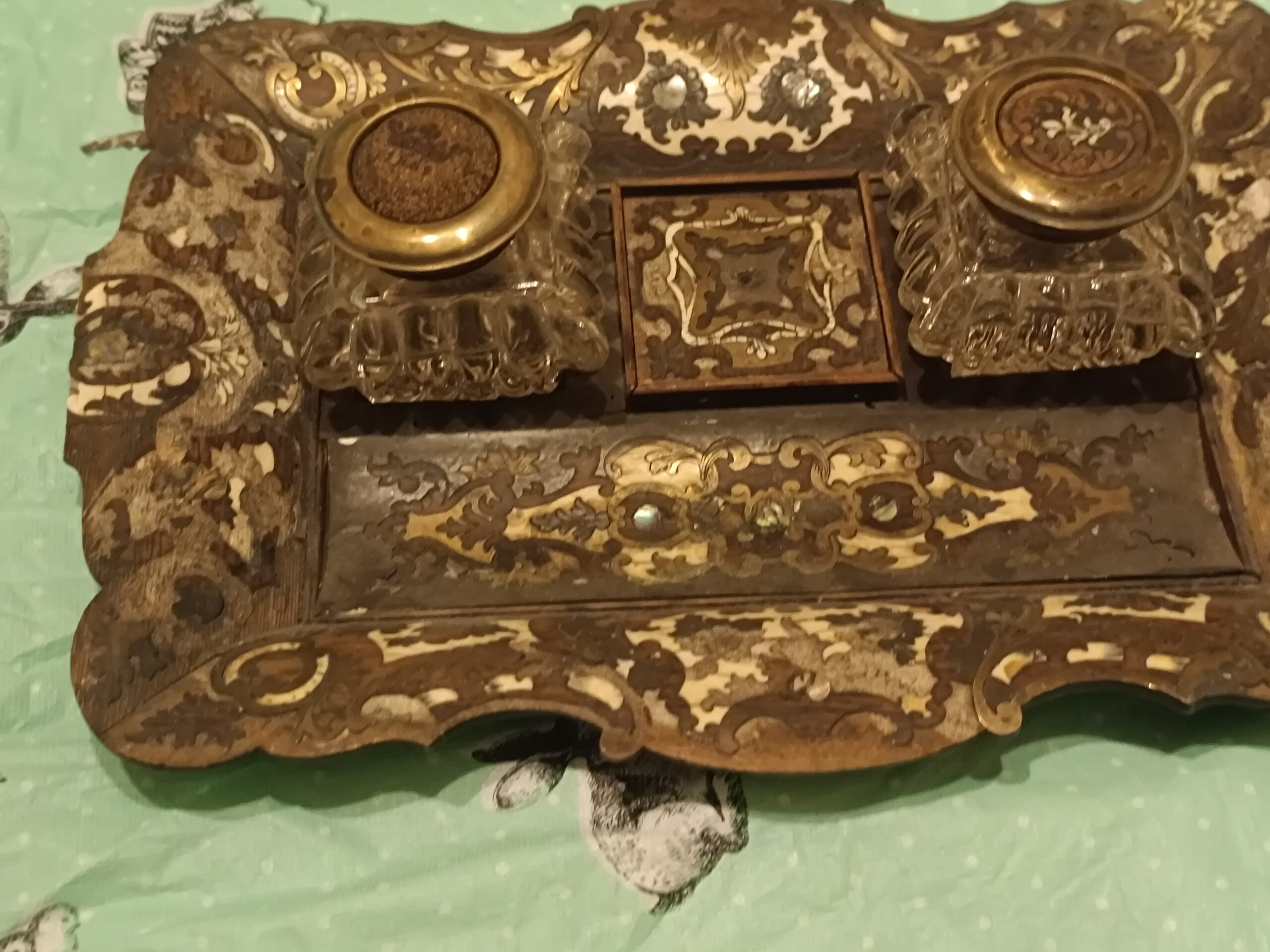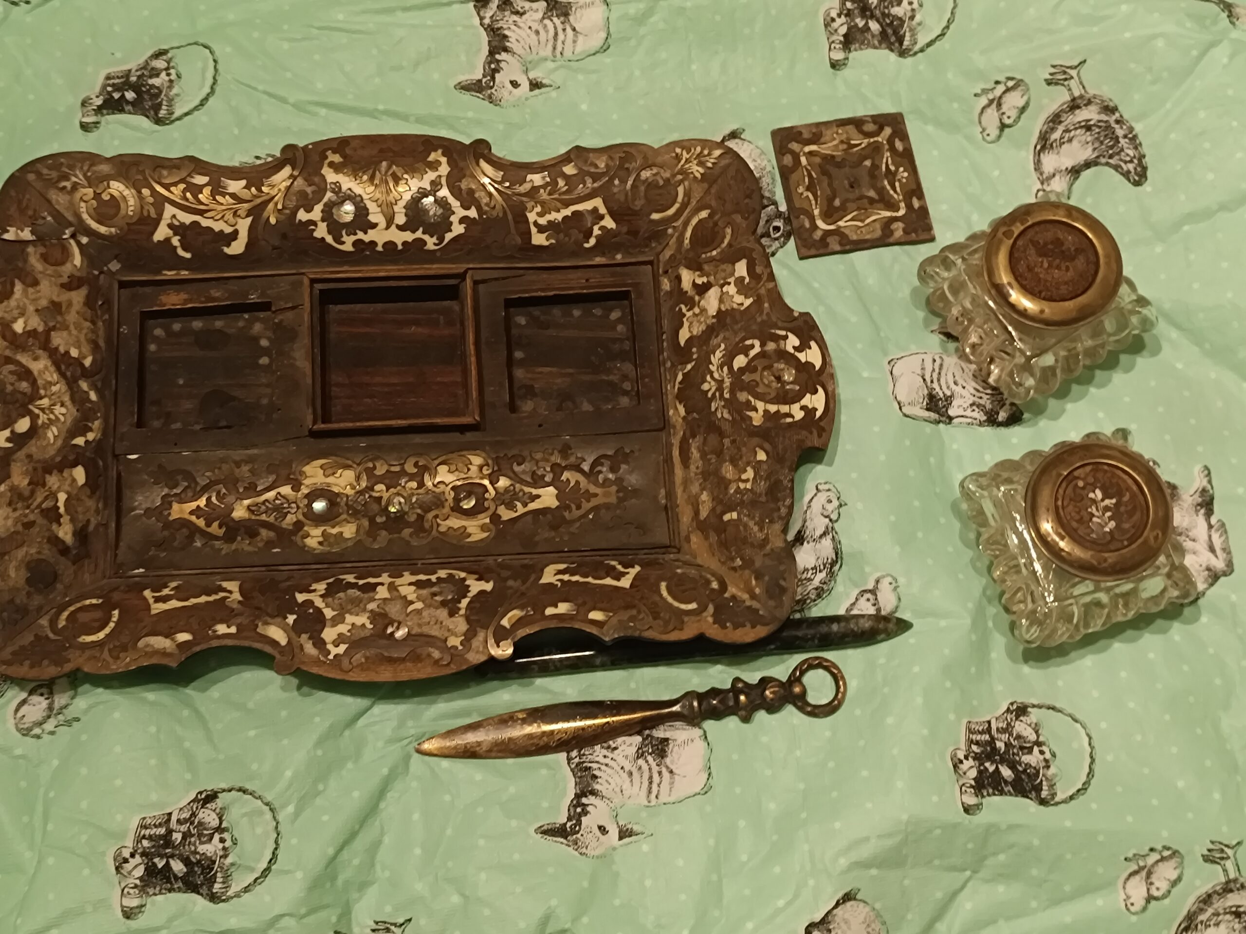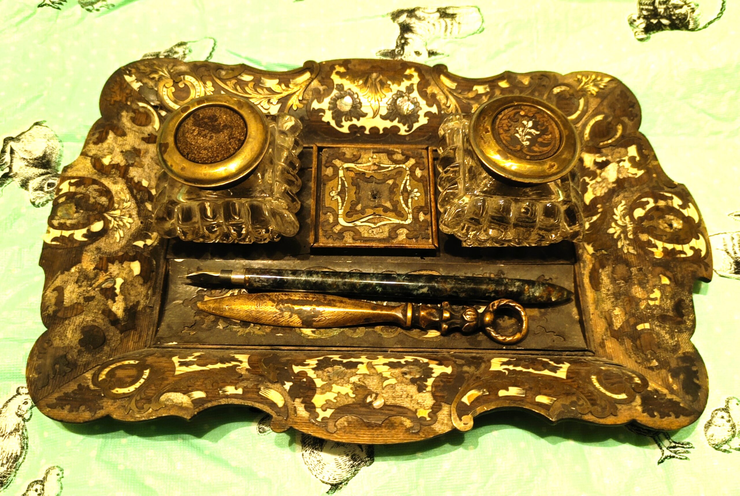 Эффектный инкрустированный письменный набор 19 века. Состояние — среднее, см фото. В комплекте — деревянный поднос, две стеклянных емкости (одна для песка, вторая для чернил). Также перо -макалка и латунный нож для вскрытия писем.
