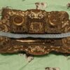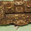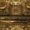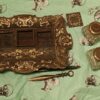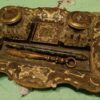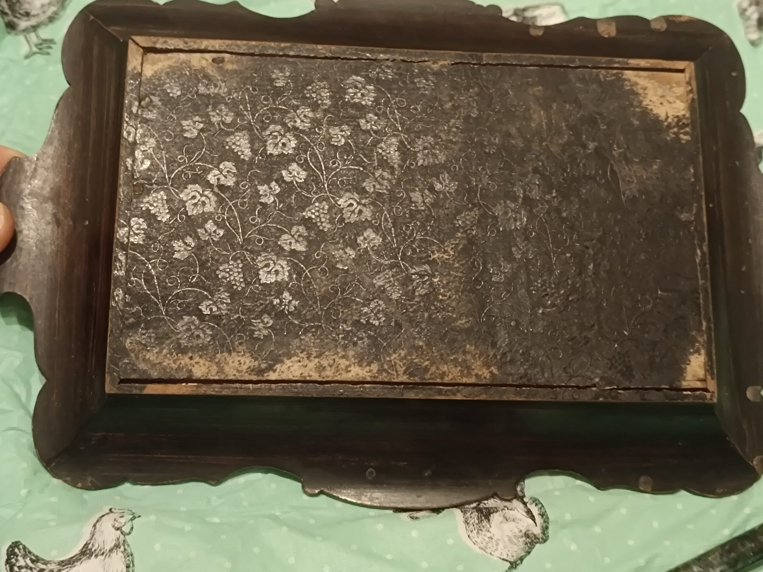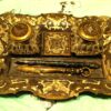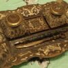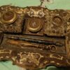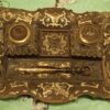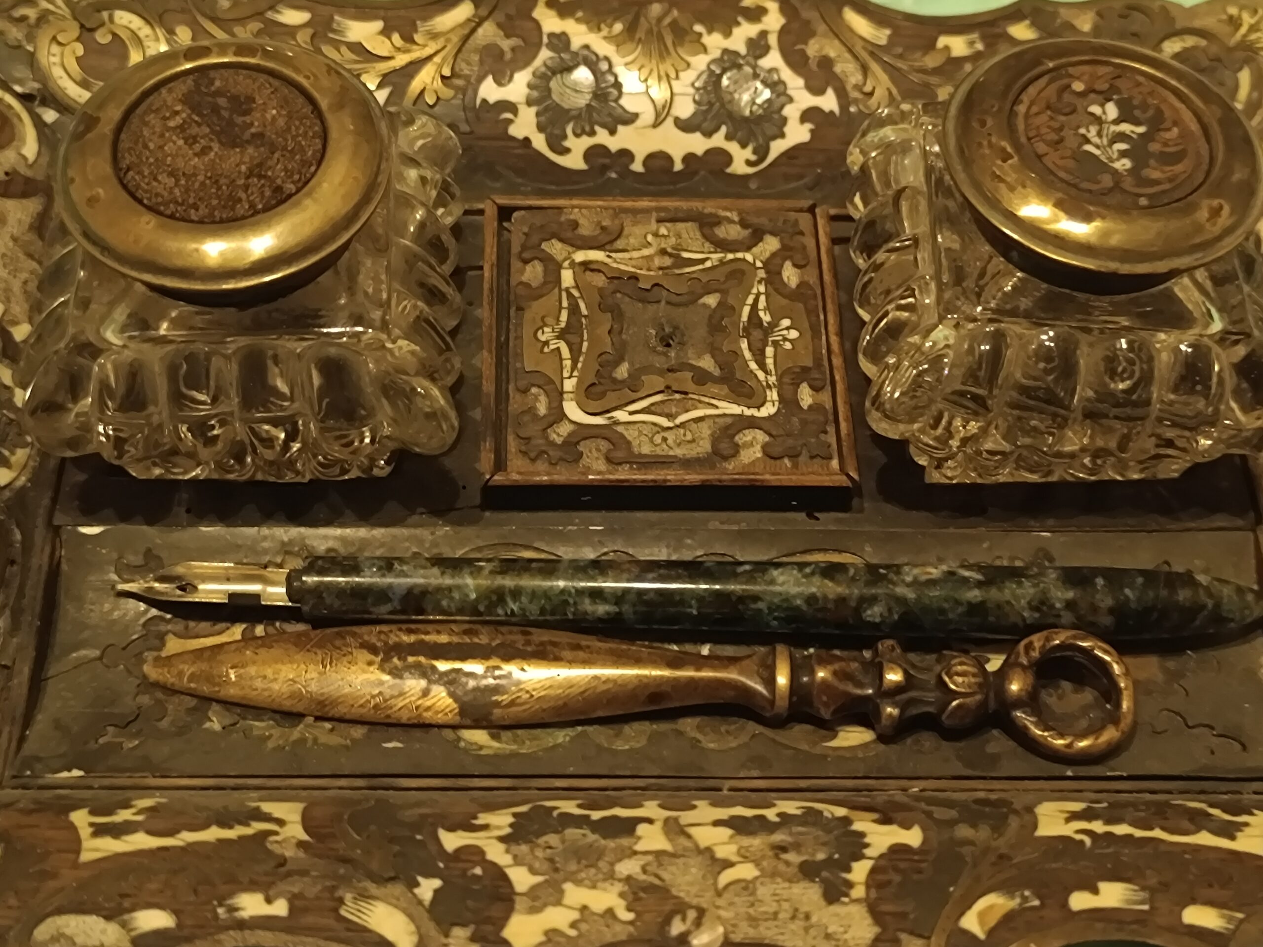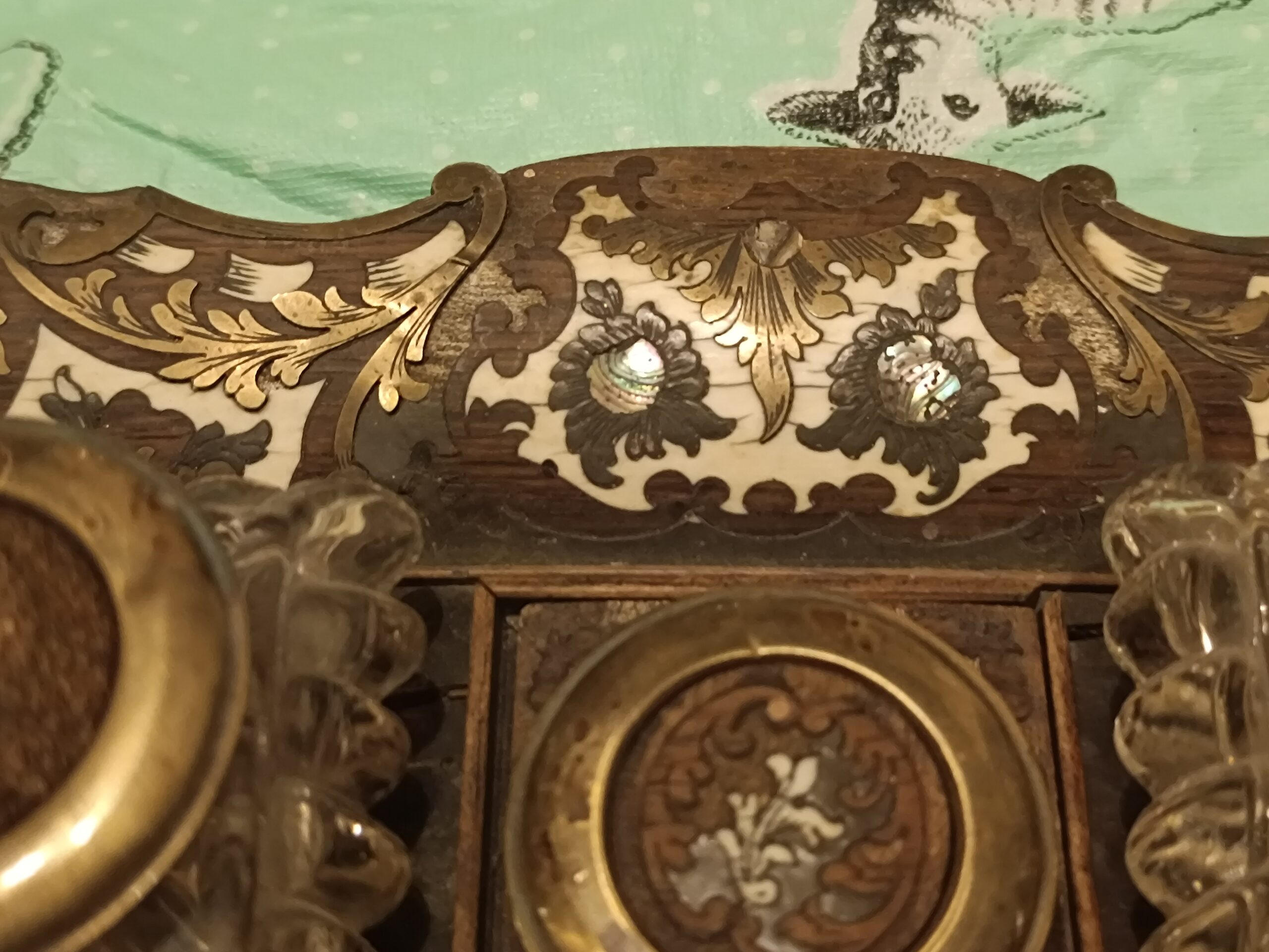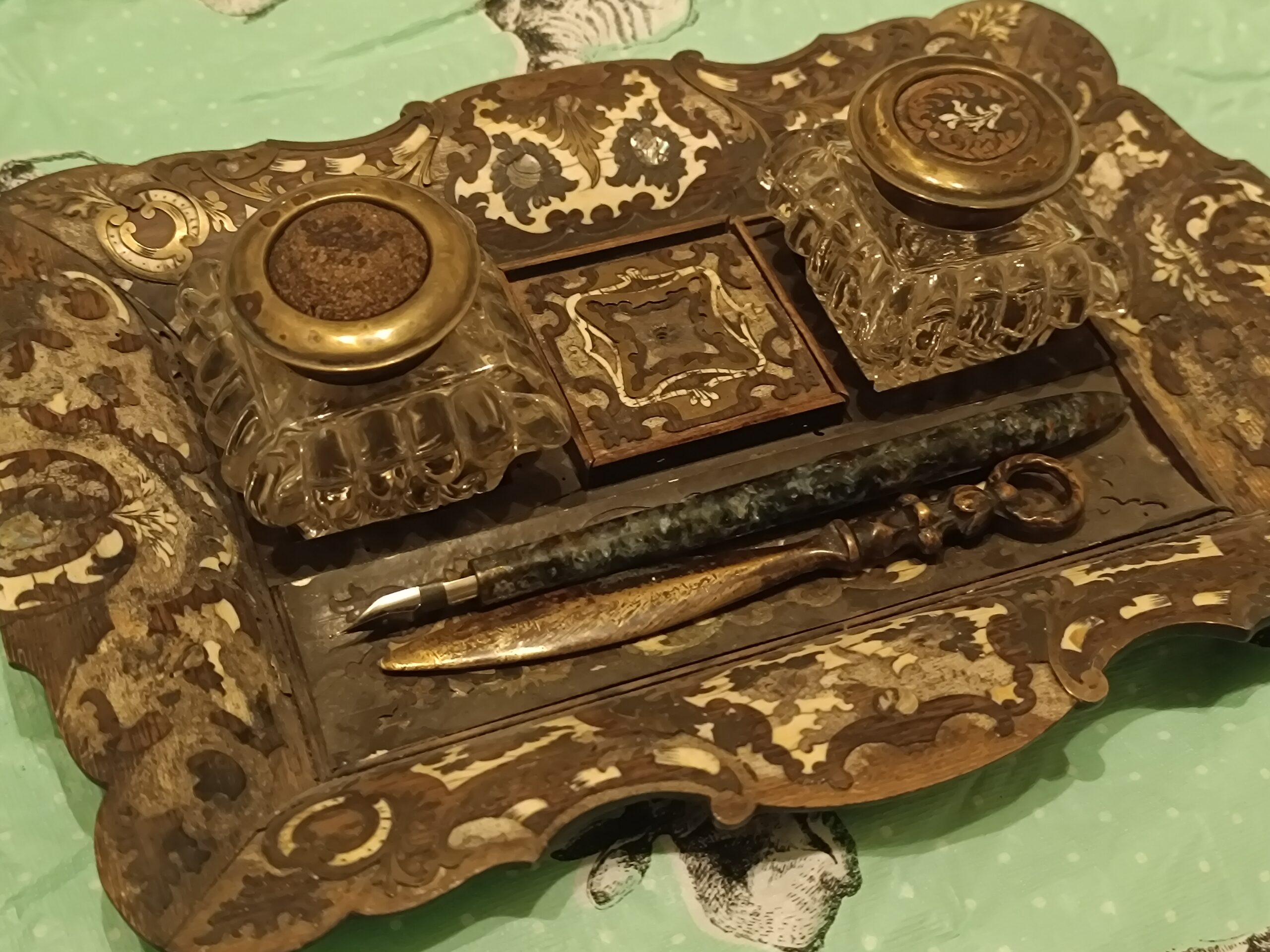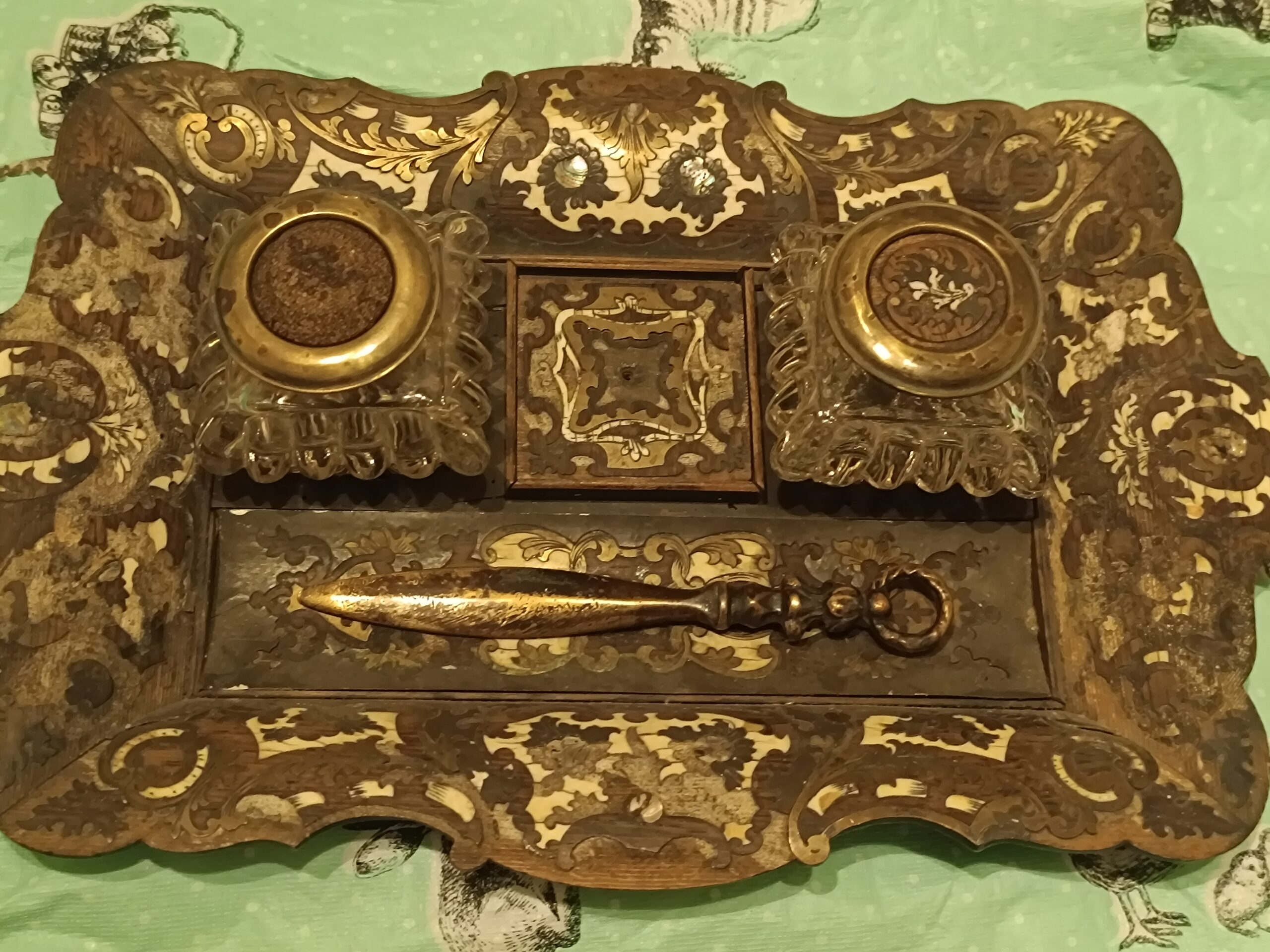 Эффектный инкрустированный письменный набор 19 века. Состояние — среднее, см фото. В комплекте — деревянный поднос, две стеклянных емкости (одна для песка, вторая для чернил). Также перо -макалка и латунный нож для вскрытия писем.