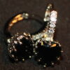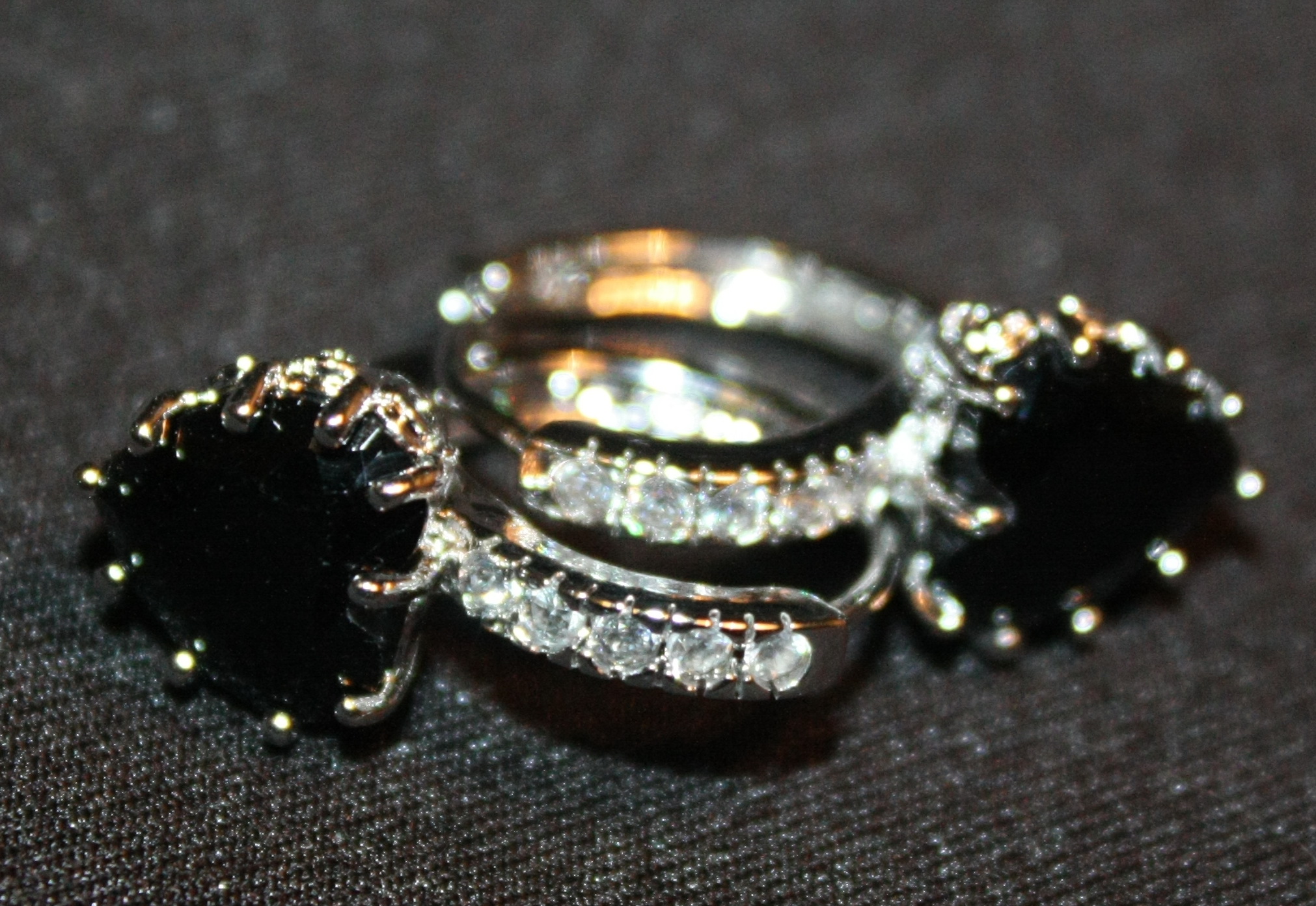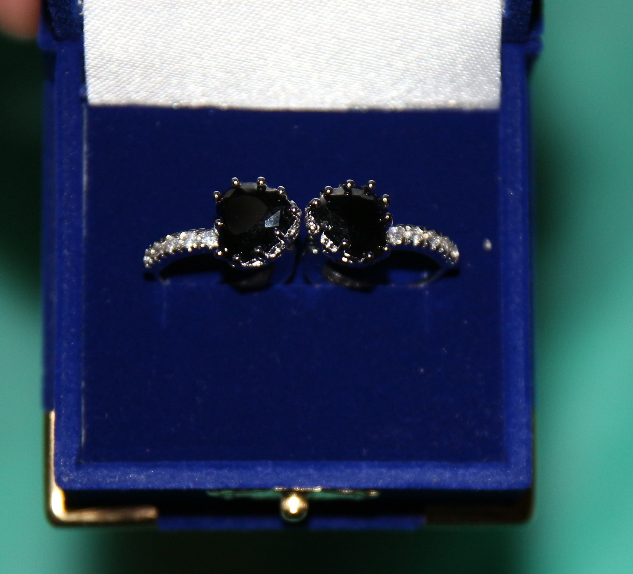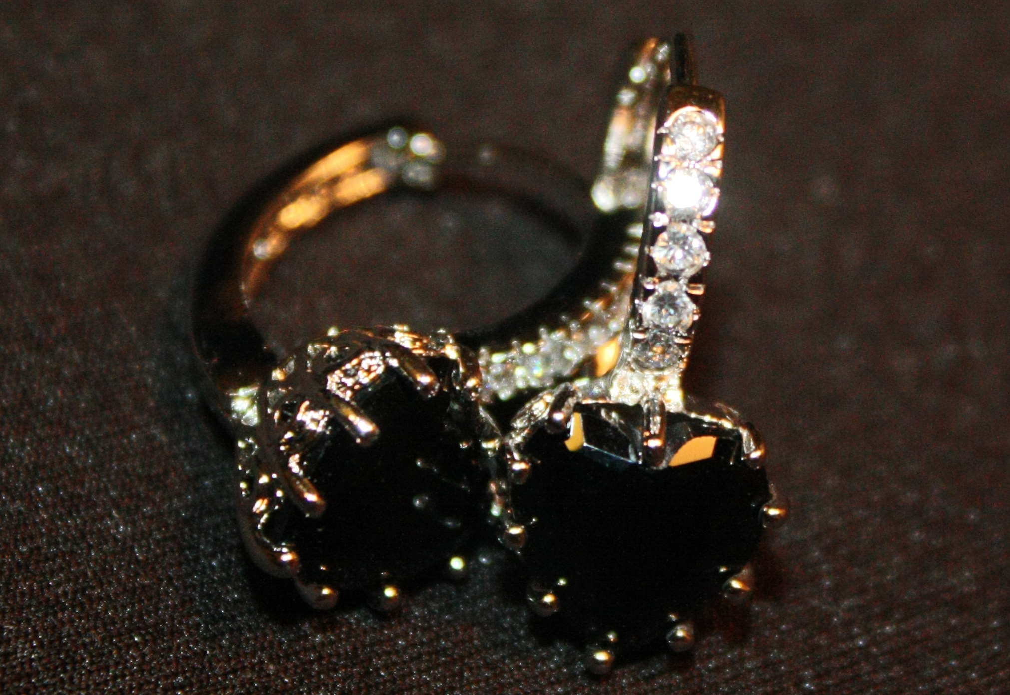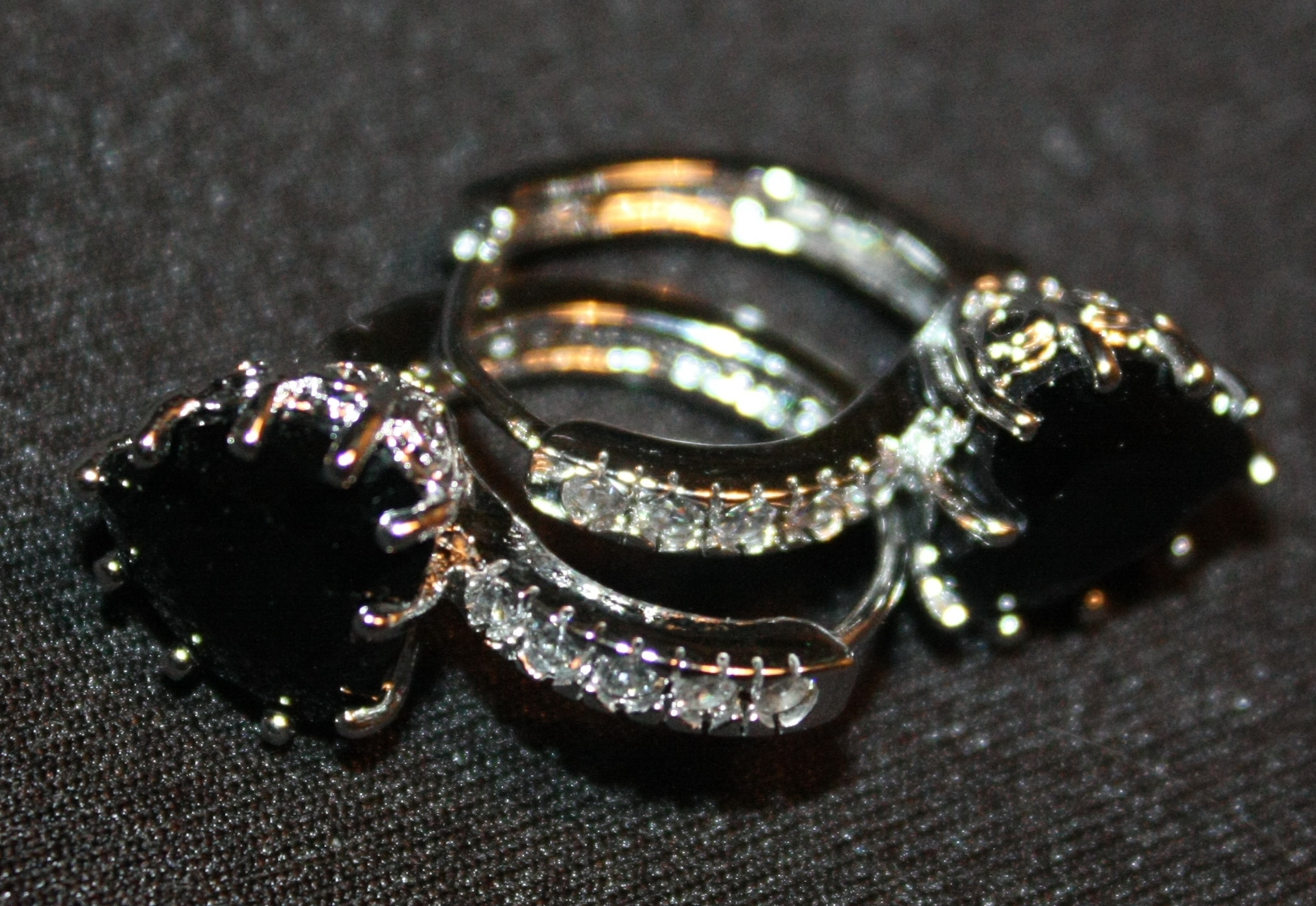 Серьги из наплавленного белого золота с крупным черным фианитом в форме сердца.