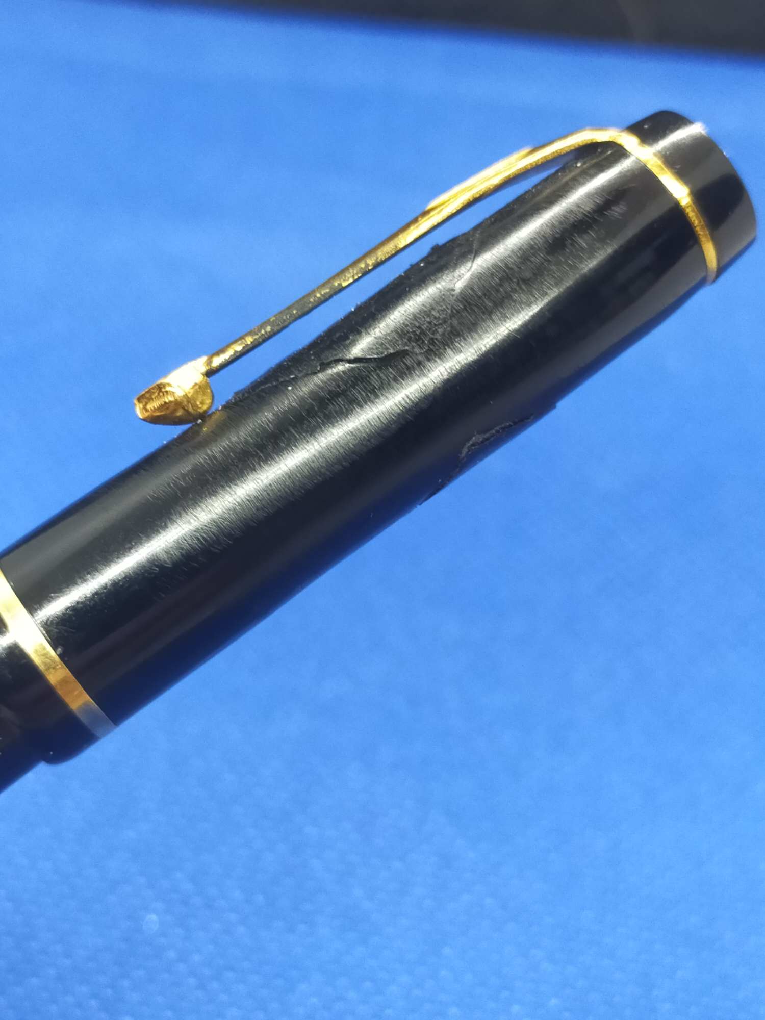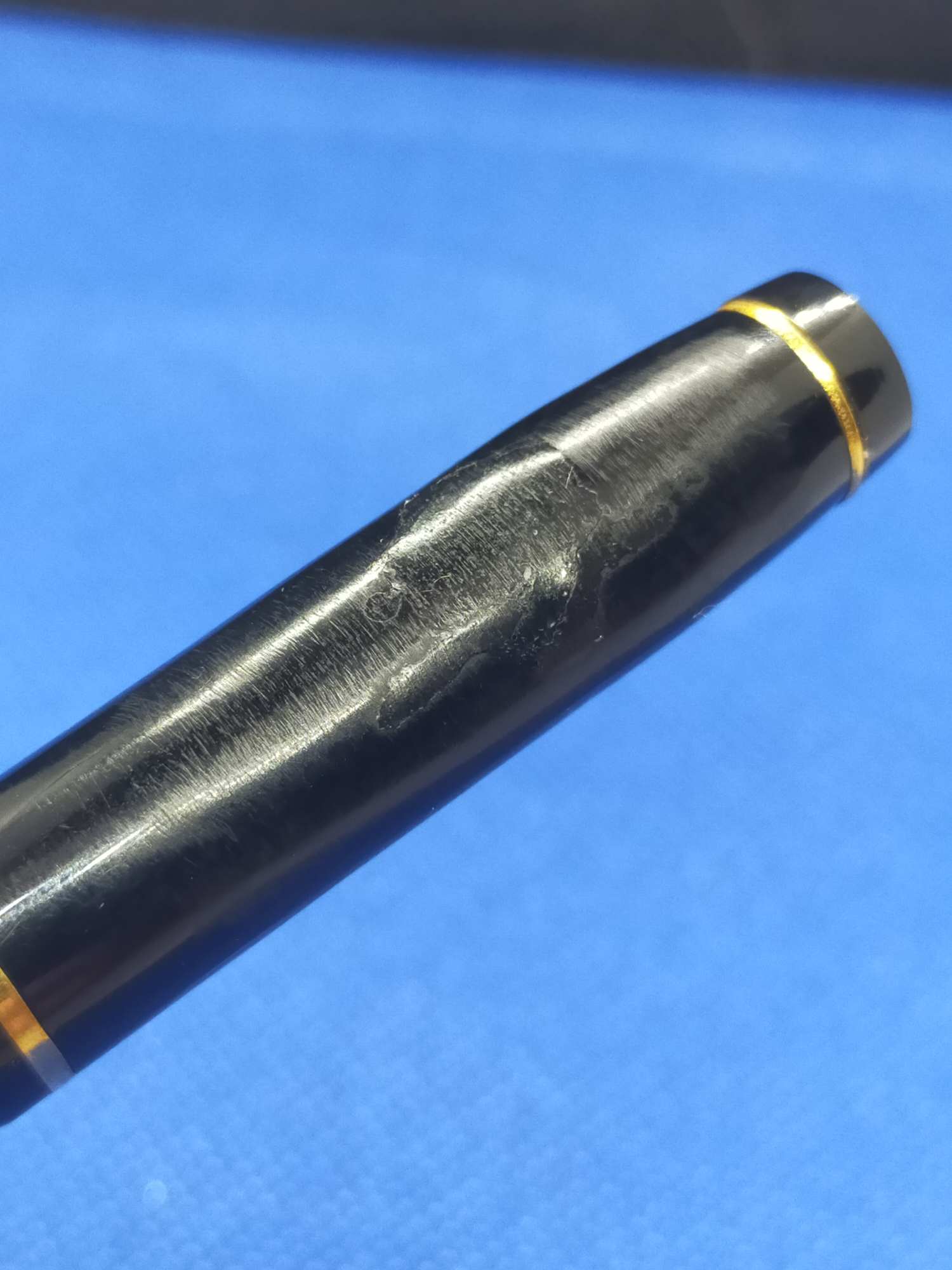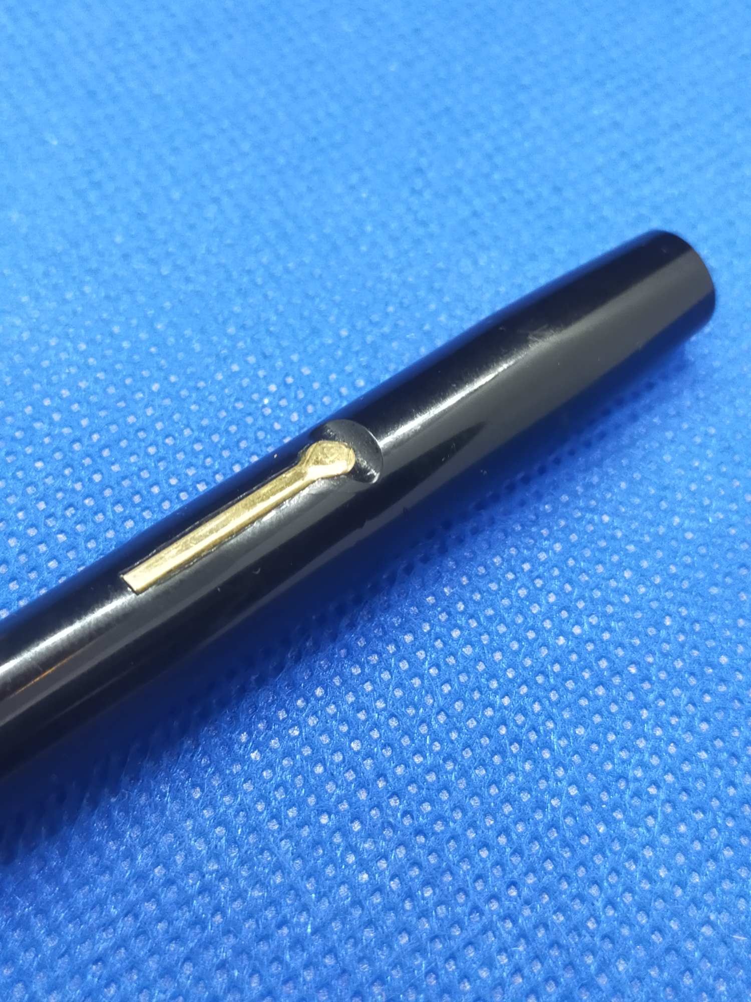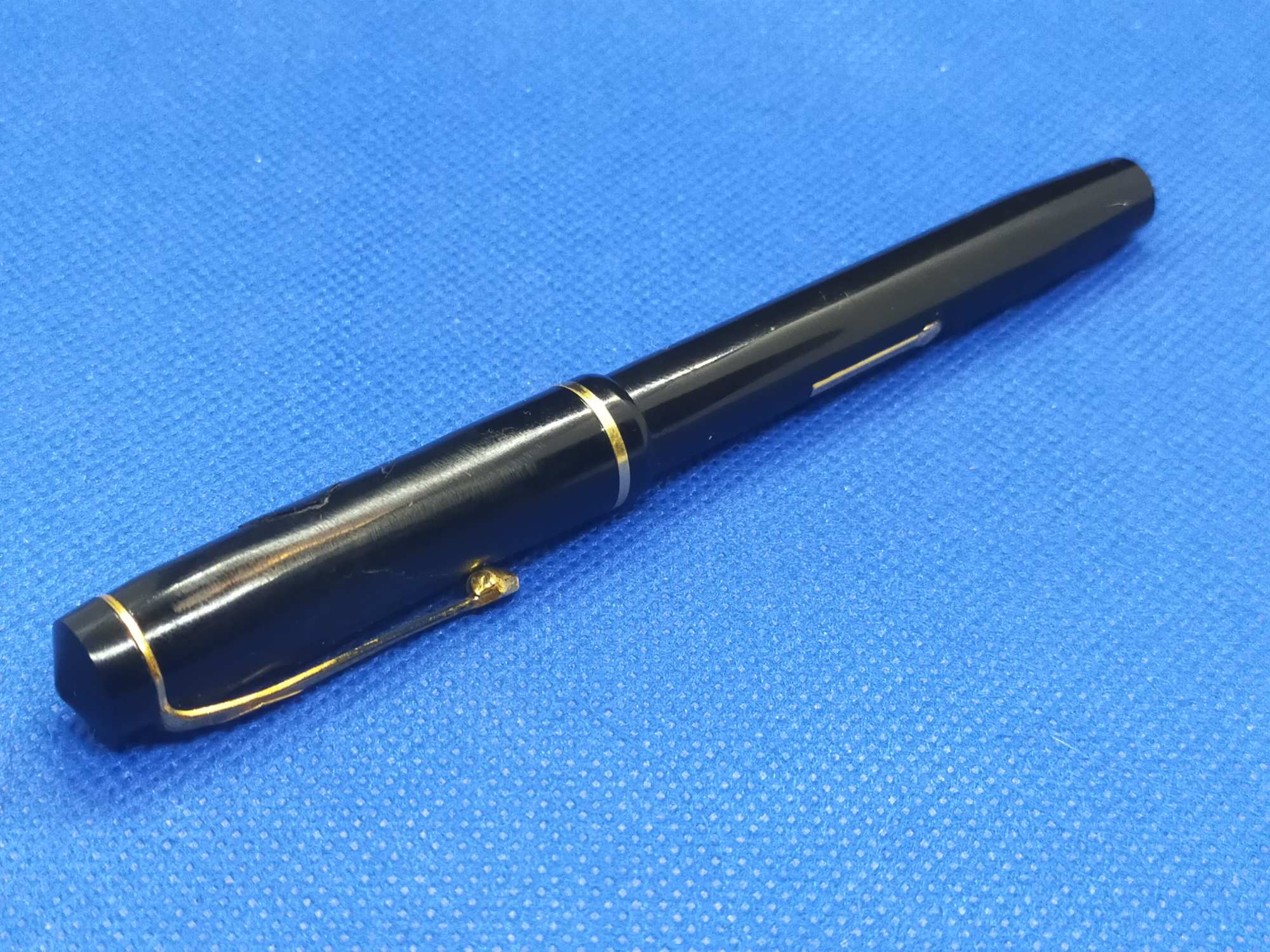 Ручка с переваренным золотым пером 55 пробы и залитым целлулоидом деформированным колпачком, см фото. Но рабочая, пишет относительно неплохо.