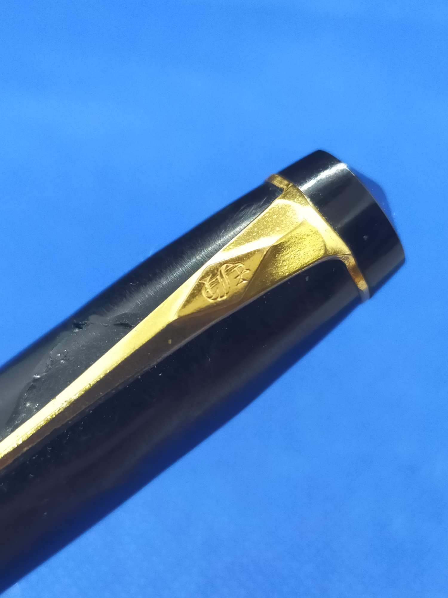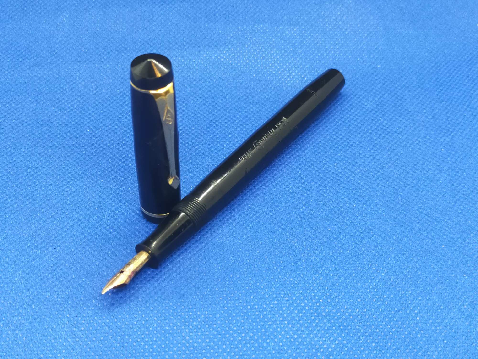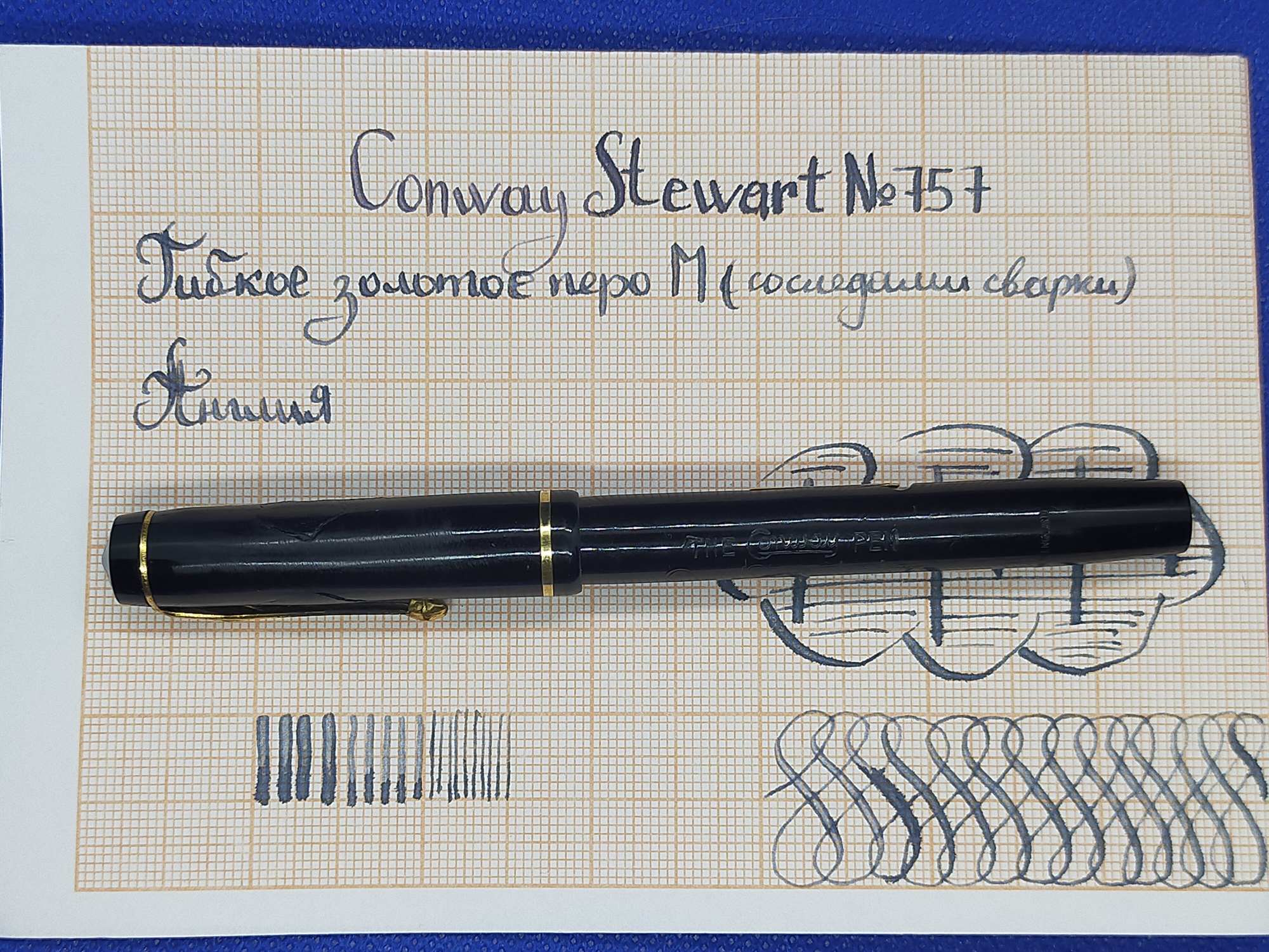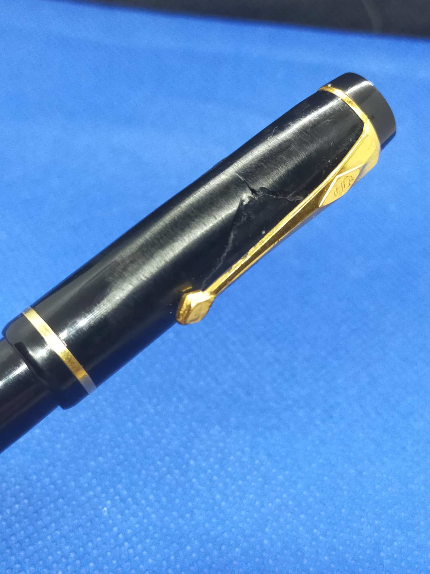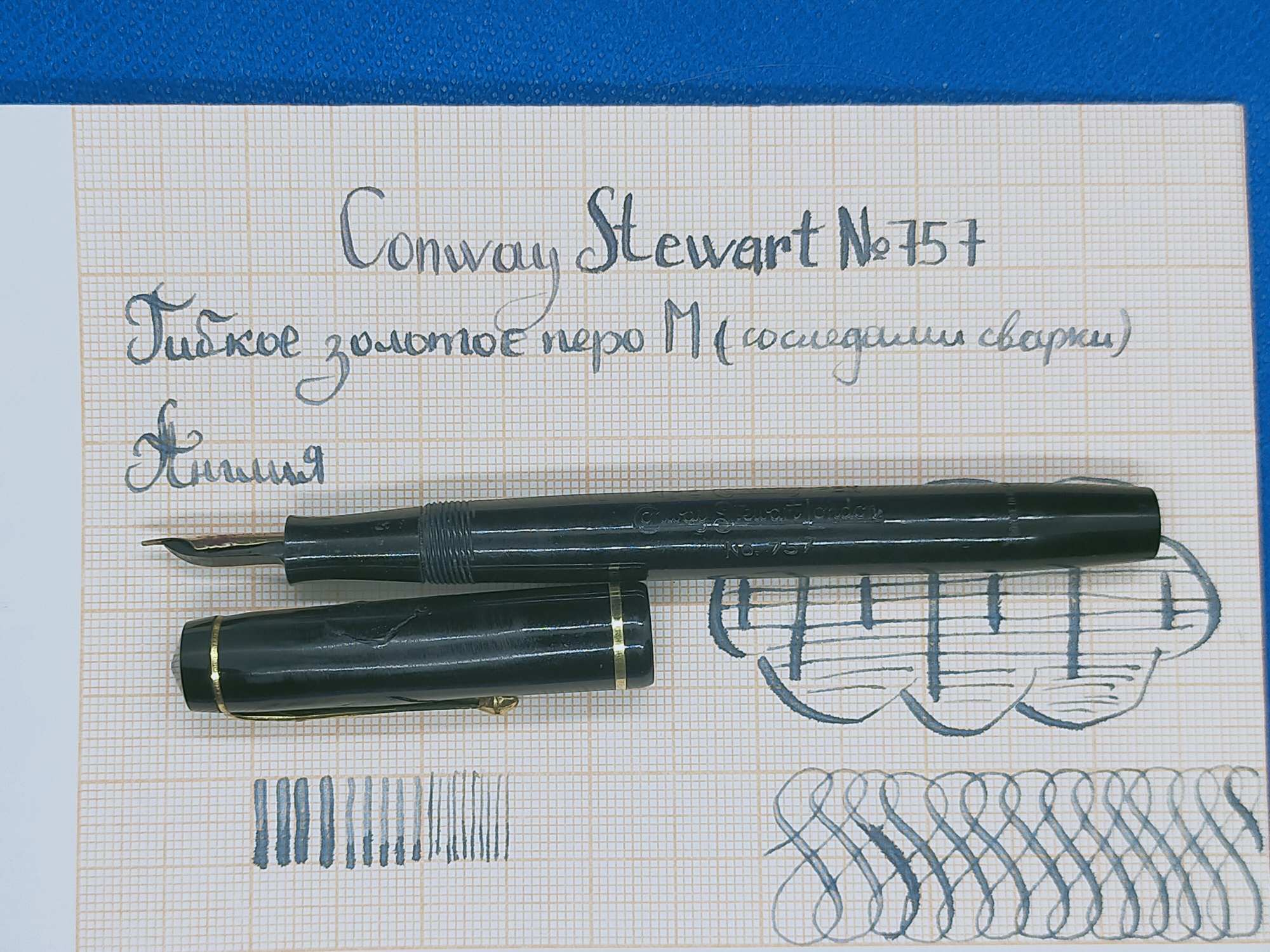 Ручка с переваренным золотым пером 55 пробы и залитым целлулоидом деформированным колпачком, см фото. Но рабочая, пишет относительно неплохо.
