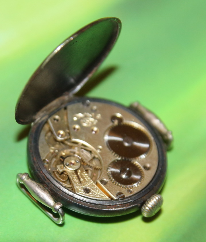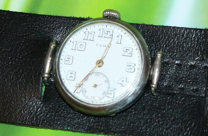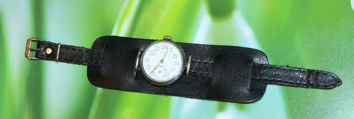 Часы CYMA в корпусе из воронёной стали, эмалевый циферблат — в отличном состоянии, без трещин и сколов. Швейцарский механизм с ручным заводом.